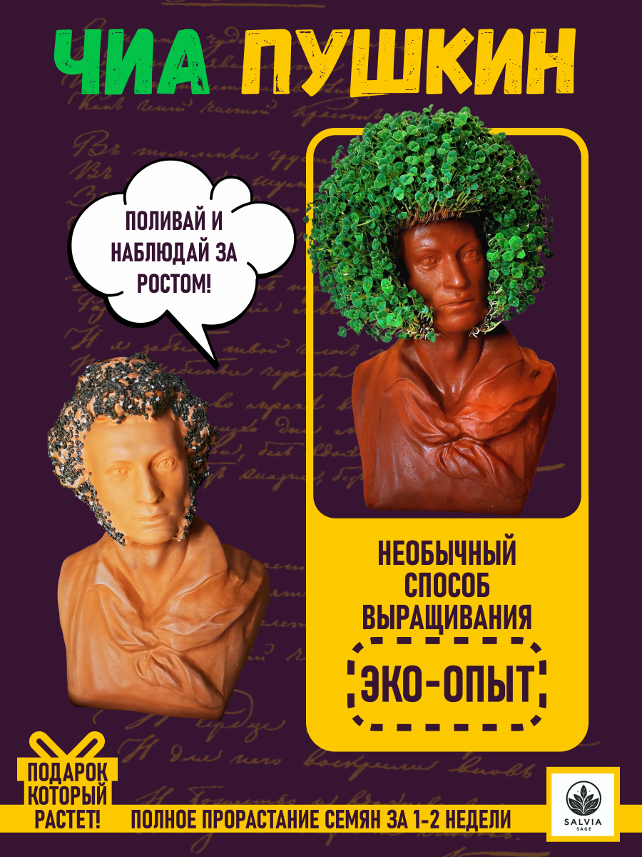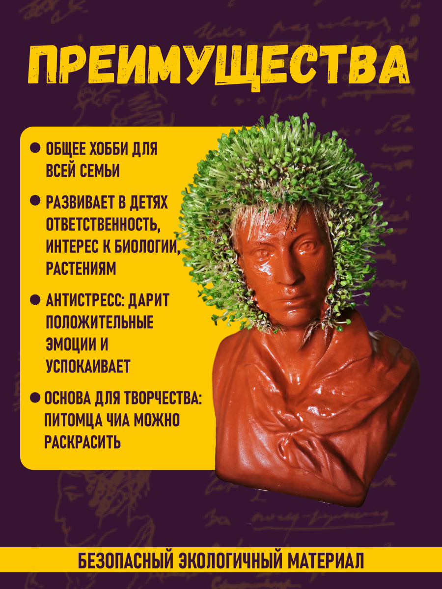 - Отличная идея для подарка! Керамическая статуэтка Пушкина с растущей волосами в виде травы чиа понравится и детям и взрослым.