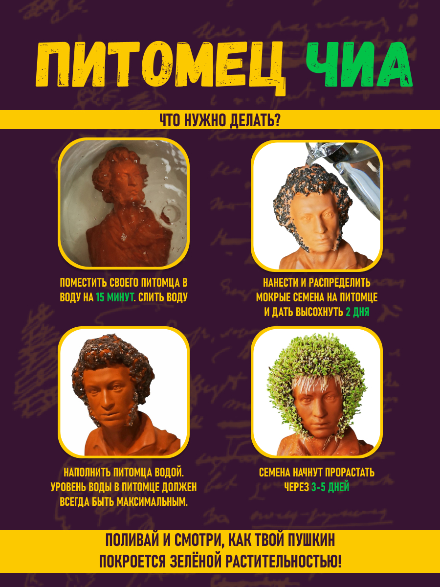 Питомец Чиа Пушкин - это керамическая фигурка в форме бюста А.С.Пушкина, покрываемая семенами чиа, которые при прорастании микрозелени напоминают волосы на голове. В верхней части кашпо есть отверстие, в которое заливается вода. Таким образом, вода проходя через поры в глине питает семена.